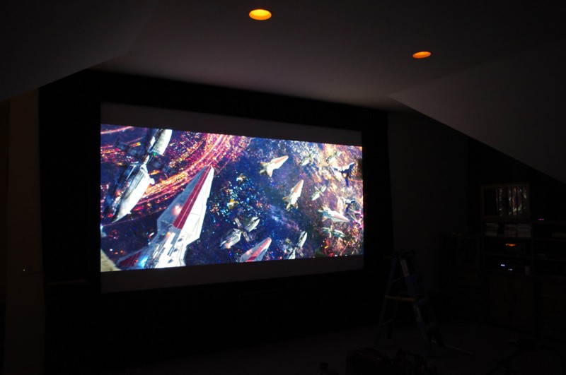 The original projector was a old epson 720p projector just shooting on the flat wall. The decision to upgrade the deceased epson to a new 1080p projector was a no brainer. After seeing how much better and brighter the new projector was, it was decided to go ahead and install a acoustically transparent screen to allow for proper color balance over the old wall, and allow the installation of 2 front effect speakers in the upper corners of the screen. The new screen size measures almost 8 1/2 feet by almost 13 feet. Being that this was larger than normal screen sizes and we would be looking at almost 3-5k for a custom factory build version, we offered to build one from scratch using bulk screen fabric and a onsite built frame.